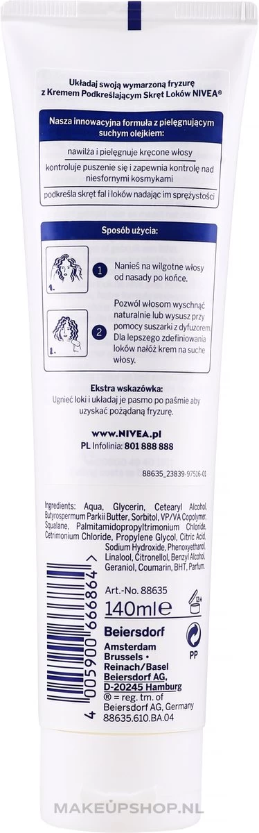 Nivea Curl Defining Creme: Vorm je droom look. Deze innovatieve formule met verzorgende lichte olie verzorgt en hydrateert gekruld haar en maakt het minder pluizig & statisch. De crème definieert krullen en zorgt voor veerkracht.