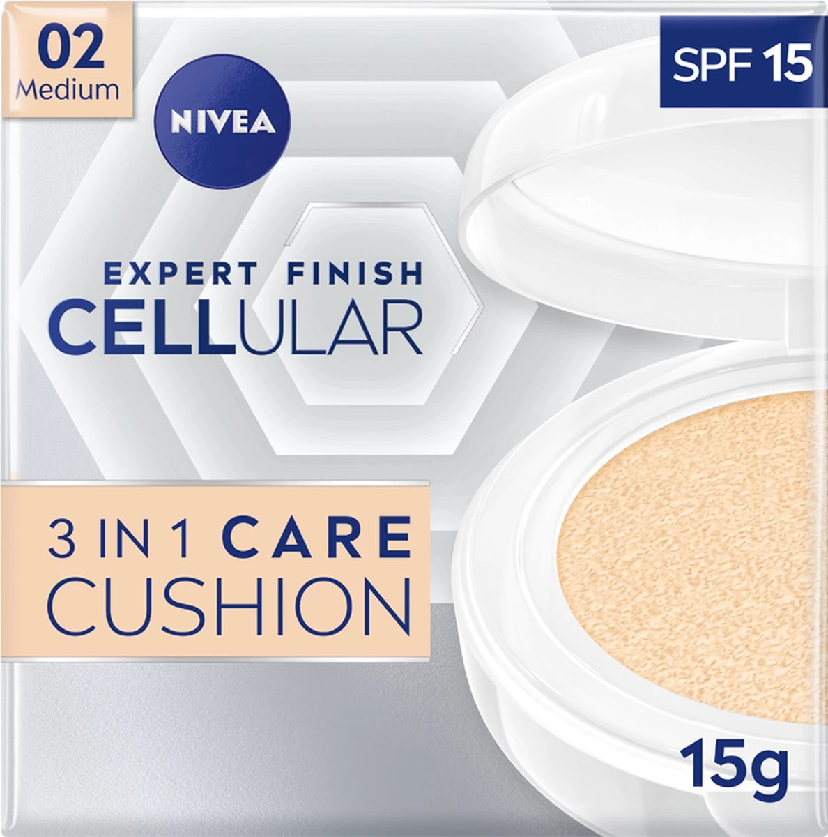 “NIVEA Expert Finish CELLular 3in1 Care Cushion – Medium SPF15: deze innovatieve 3in1 Care Cushion smelt met je teint samen en geeft een ademend gevoel voor de huid.