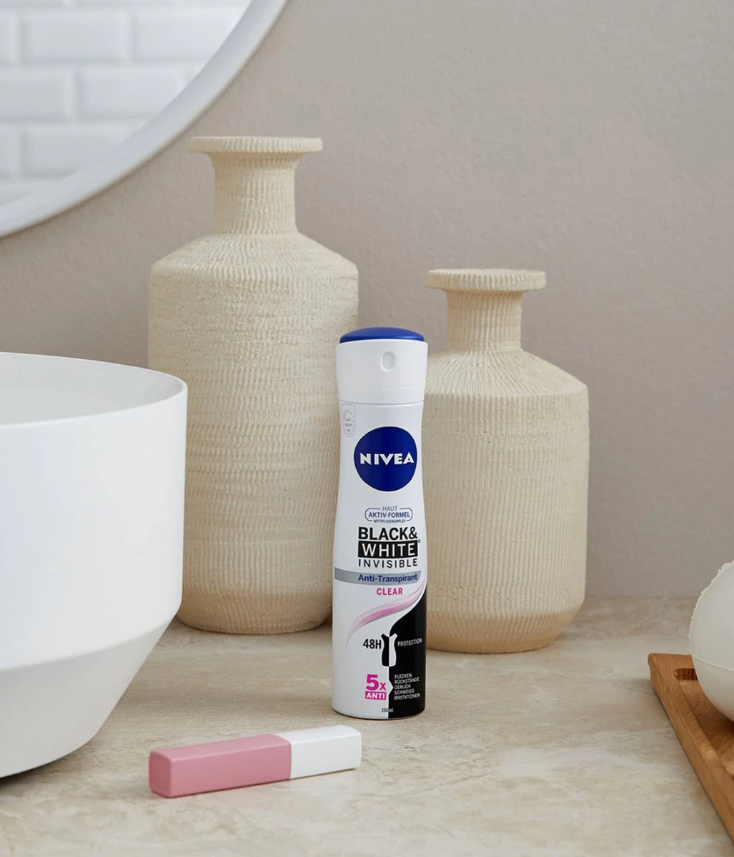 NIVEA Invisible For Black & White Clear Anti-Transpirant is de eerste anti-transpirant die zowel witte strepen op donkere kleding als ook gele vlekken in lichte kleding voorkomt. Geeft 48 uur lang betrouwbare bescherming tegen transpiratie en lichaamsgeur en biedt de milde verzorging van NIVEA.