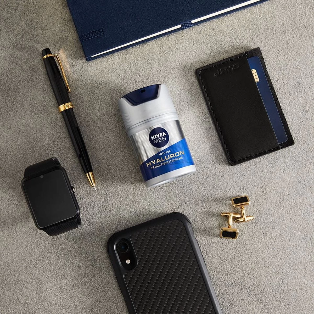 NIVEA MEN Anti-Age Hyaluron Gezichtcrème SPF 15 met hyaluronzuur – is een ideaal gezichtsverzorgingsproduct voor mannen voor een gezonde en jonger uitziende huid. De crème met hyaluronzuur heeft een celactiverend anti-age effect, vermindert zichtbaar rimpels en verstevigt de huid effectief. De gezichtscrème revitaliseert, versterkt de elasticiteit van de huid en hydrateert de huid gedurende 24 uur. De crème vermindert niet alleen rimpels, de SPF 15 beschermt ook tegen de door de zon veroorzaakte rimpelvorming.