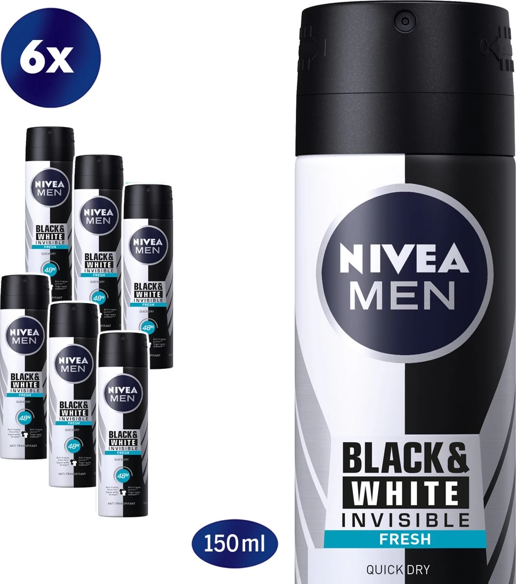 NIVEA MEN Invisible for Black & White Fresh Anti-Transpirant, de eerste anti-transpirant die effectief 48 uur tegen transpiratie beschermt én jouw kleding beschermt tegen witte strepen op zwarte kleding en gele vlekken in witte kleding. Dus: zwart blijft zwart en wit blijft langer wit, zodat je favoriete kleding er langer goed uit blijft zien. Met een extra frisse sensatie. Nu kom jij zelfverzekerd de hele dag door met betrouwbare bescherming!