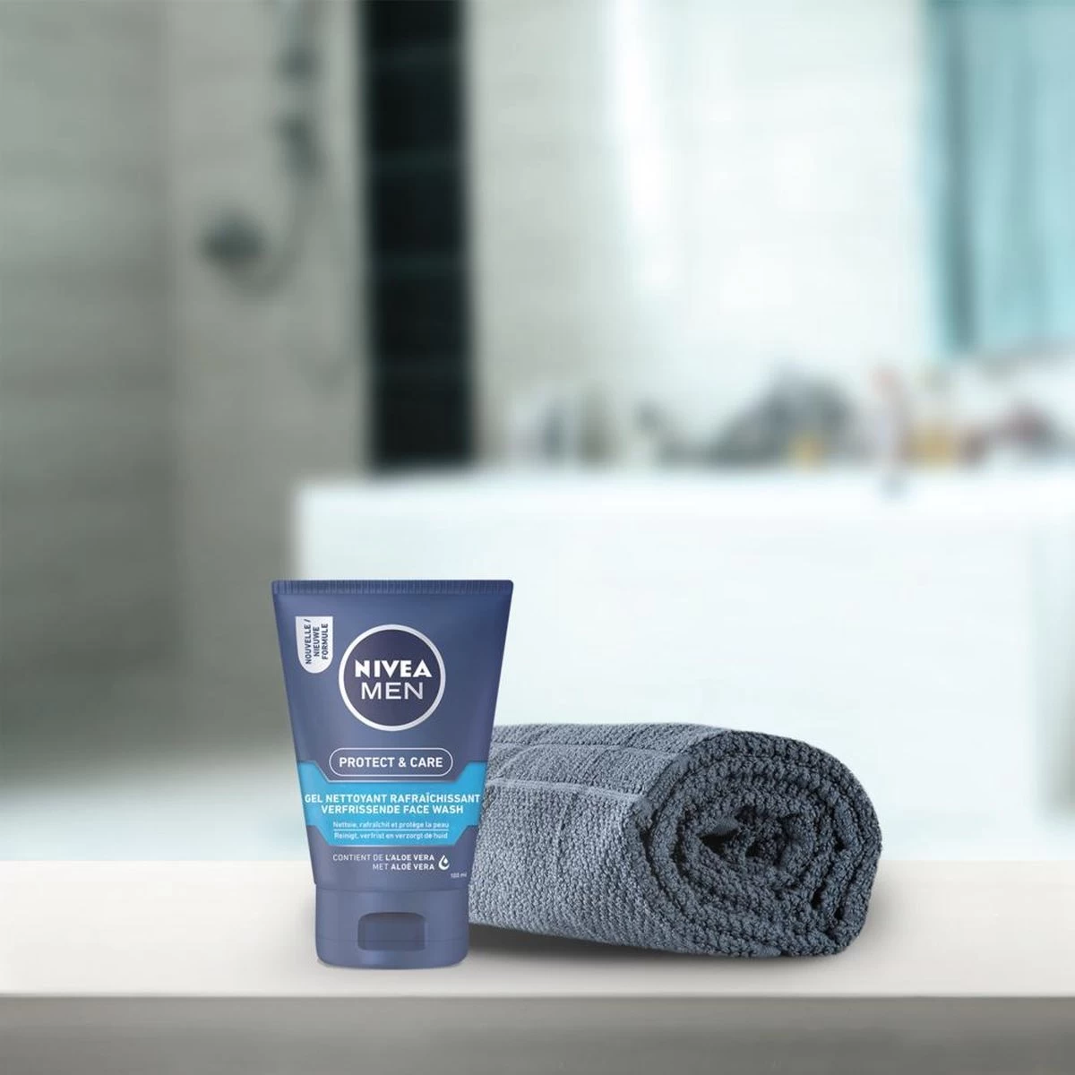 NIVEA MEN Protect & Care Verfrissende Face Wash 100ml. Reinigt je huid grondig en helpt onzuiverheden en overtollig talg te verwijderen. De formule met Aloë Vera en Pro-Vitamine B5 reinigt de huid en beschermt haar tegen uitdrogen.