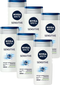 NIVEA MEN Sensitive Douchegel. VOOR MANNEN die een verzachtende douche willen met een intensieve verzorging van de gevoelige huid. De 3-in-1 douchegel voor lichaam, gezicht en haar is de beste manier om je huid te verzachten. Voor een voelbaar zachte huid na elke douche. De formule is 99% biologisch afbreekbaar * en de fles is gemaakt van tot wel 97% gerecycled materiaal **