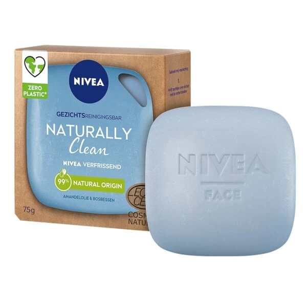 De Nivea Naturally Clean Verfrissende Reinigingsbar bevat amandelolie en bosbessen. De bar is vrij van plastic* en 99% van natuurlijke oorsprong.