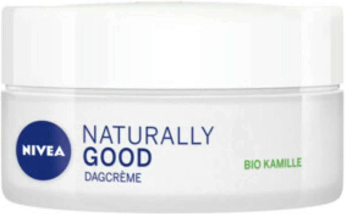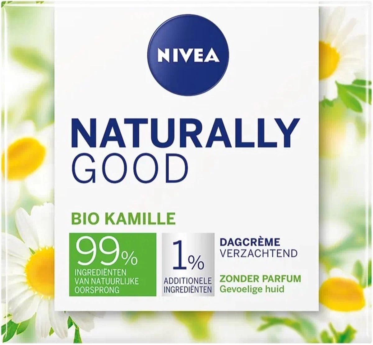 NIVEA Naturally Good Dagcrème Sensitive is gemaakt met uw gevoelige huid in gedachten. De formule met 99% ingrediënten van natuurlijke oorsprong* en 1% additionele ingrediënten voor formule stabiliteit en veiligheid is bijzonder mild voor uw huid. De dagcrème hydrateert je huid gedurende 24 uur en kalmeert huidirritaties en vermindert zichtbaar roodheid. De dagcrème met bio Kamille geeft onmiddellijke verlichting van een trekkerig gevoel en is parfumvrij. Huidvriendelijkheid dermatologisch goedgekeurd.