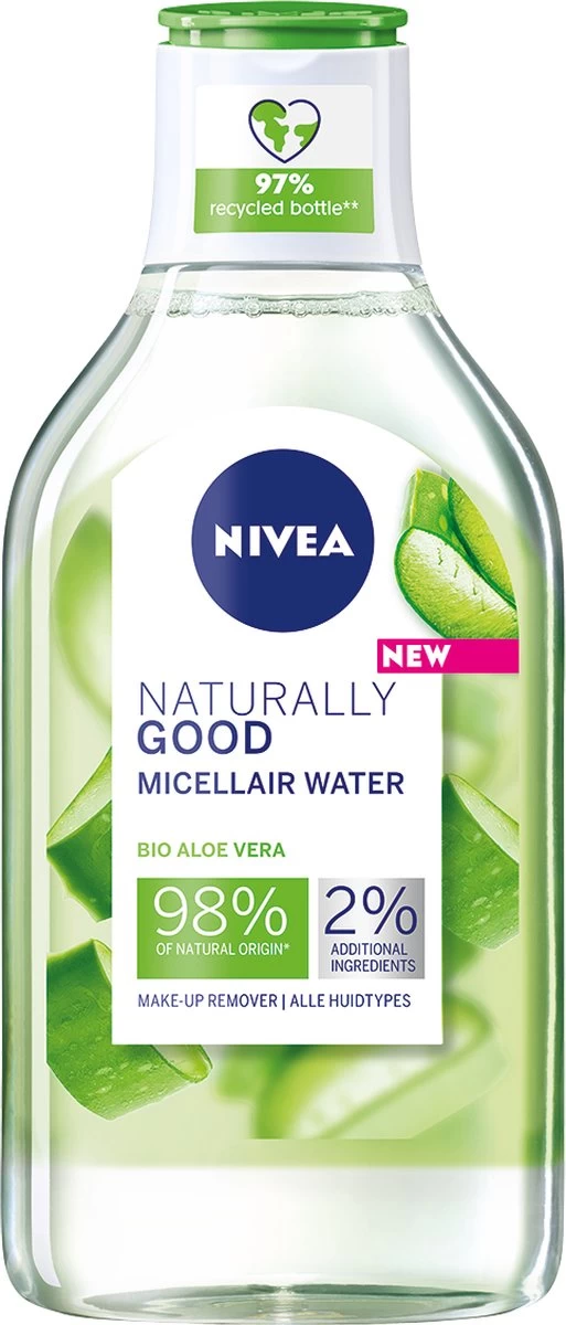 Ontdek de nieuwe Nivea Naturally Good Micellair Water met biologische aloë vera. De verfrissende formule verwijdert effectief make-up en reinigt en hydrateert je huid op milde wijze. Voor een perfect schone huid die kan ademen.