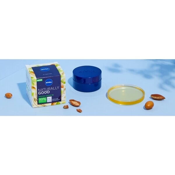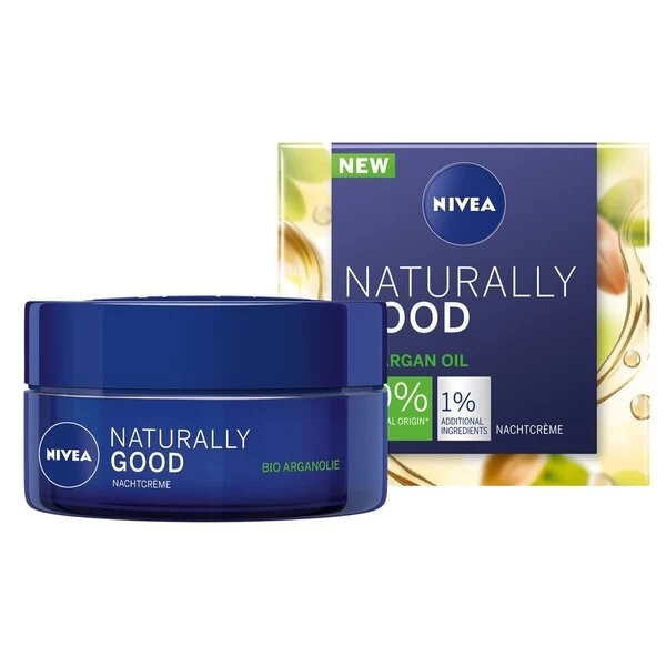 NIVEA Naturally Good Nachtcrème is gemaakt van 99% ingrediënten van natuurlijke oorsprong* en biedt 100% transparantie over alle ingrediënten die erin zitten.