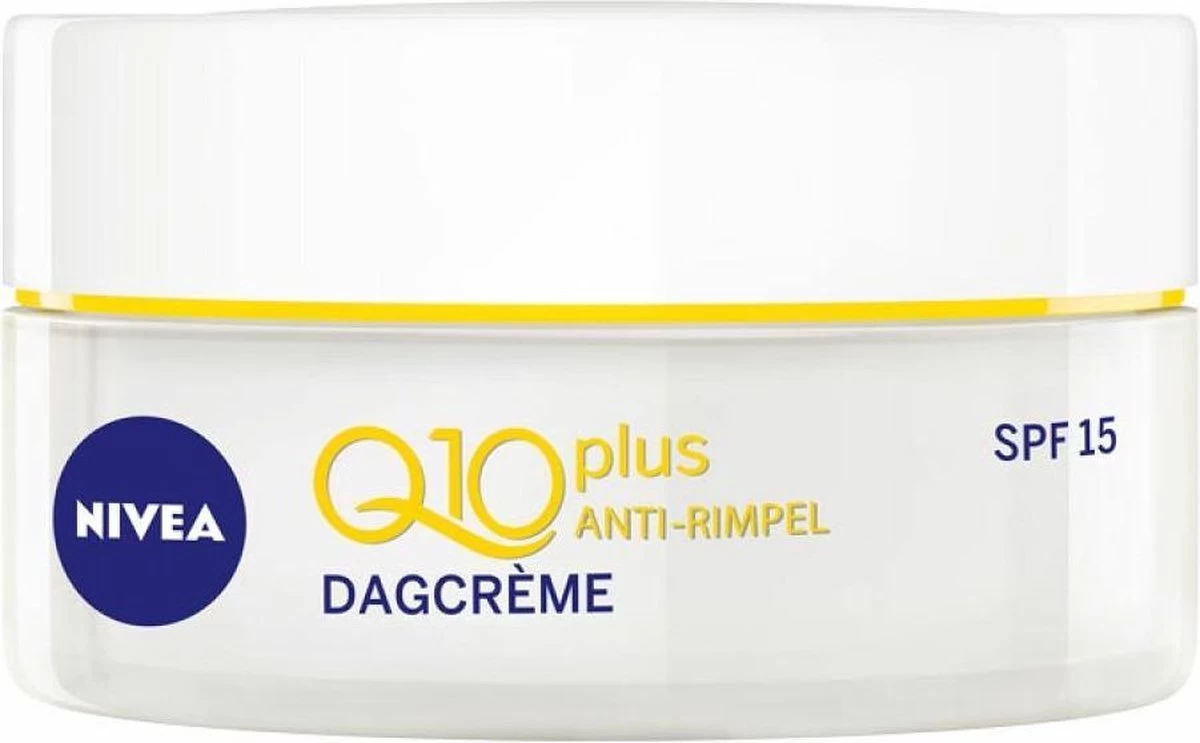 NIVEA Q10 Power Anti-Rimpel Dagcrème SPF15 50ml bevat Q10 die 100% identiek is aan het huideigen Q10. De dagcrème met co-enzym Q10 met dubbele werking zorgt voor een 24u anti-rimpel werking, beschermt de huid tegen vrije radicalen en externe invloeden** en geeft de huid energie terwijl het het natuurlijke huidverouderingsproces afremt. De innovatieve formule met SPF15 zorgt voor zichtbaar verminderde rimpels en beschermt tegen UVA/UVB-stralen die vroegtijdige huidveroudering kunnen veroorzaken. De huid voelt gladder, meer gevoed en gezonder aan. Zichtbaar stevigere huid, verminderde rimpels vanaf 1 week*, voortdurende verbeteringen** en voorkomt nieuwe rimpels. NIVEA Q10 Power Anti-Rimpel Dagcrème SPF15 is geschikt voor alle huidtypen. Huidvriendelijkheid dermatologisch goedgekeurd.