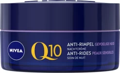 NIVEA Q10 POWER Anti-Rimpel Verzachtende Nachtcrème is speciaal geschikt voor de gevoelige huid. De formule combineert het cel-actieve Q10 met Creatine waardoor effectief fijne lijntjes en rimpels worden verminderd en de huid steviger aanvoelt. Door de toevoeging van Zoethout Extract worden 3 tekenen van een gevoelige huid verminderd: roodheid, droogheid en een trekkerig gevoel. De intensief voedende formule herstelt de huid gedurende de nacht wanneer deze daar het meest ontvankelijk voor is.
