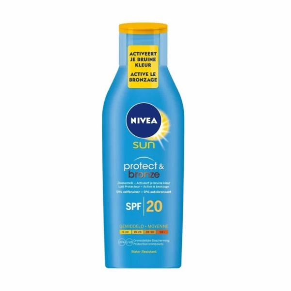 De formule van Nivea Sun Protect & Bronze SPF20 Zonnemelk beschermt direct tegen zonnebrand en vroegtijdige huidveroudering.