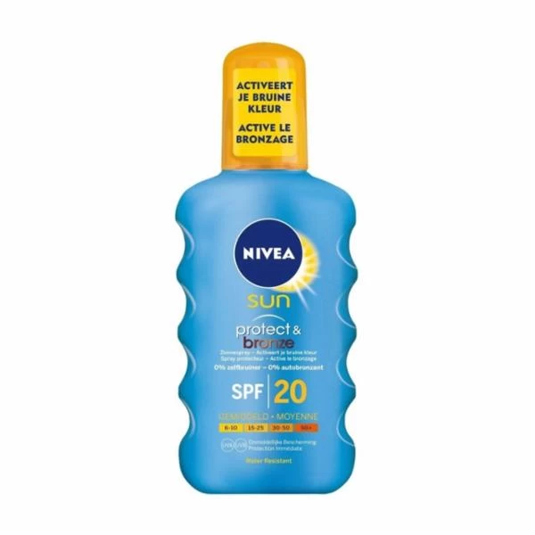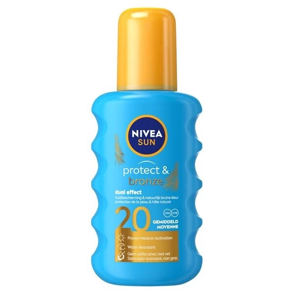 De formule van Nivea Sun Protect & Bronze SPF20 Zonnespray beschermt direct tegen zonnebrand en vroegtijdige huidveroudering én activeert je bruine kleur.
