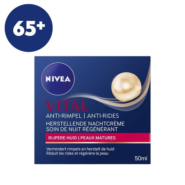 Nivea Vital Anti-Rimpel 65+ Herstellende Nachtcrème versterkt je kwetsbare, droge en rijpere huid gedurende de nacht. De crème zorgt voor een verzorgde en ontspannen huid in de ochtend.