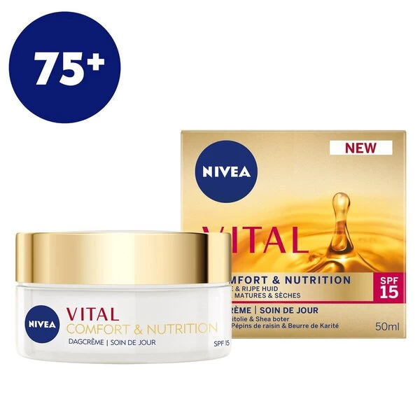 Nivea Vital Comfort & Nutrition SPF15 75+ Dagcrème is speciaal ontwikeld voor je rijpe en droge huid en voedt je huid intensief. De formule is verrijkt met natuurlijke druivenpitolie en sheaboter.