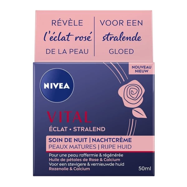 De Nivea Vital Stralend Nachtcrème bevat rozenolie en calcium die je huid intensief voeden tijdens de nacht. De crème geeft een comfortabel gevoel bij het ontwaken.
